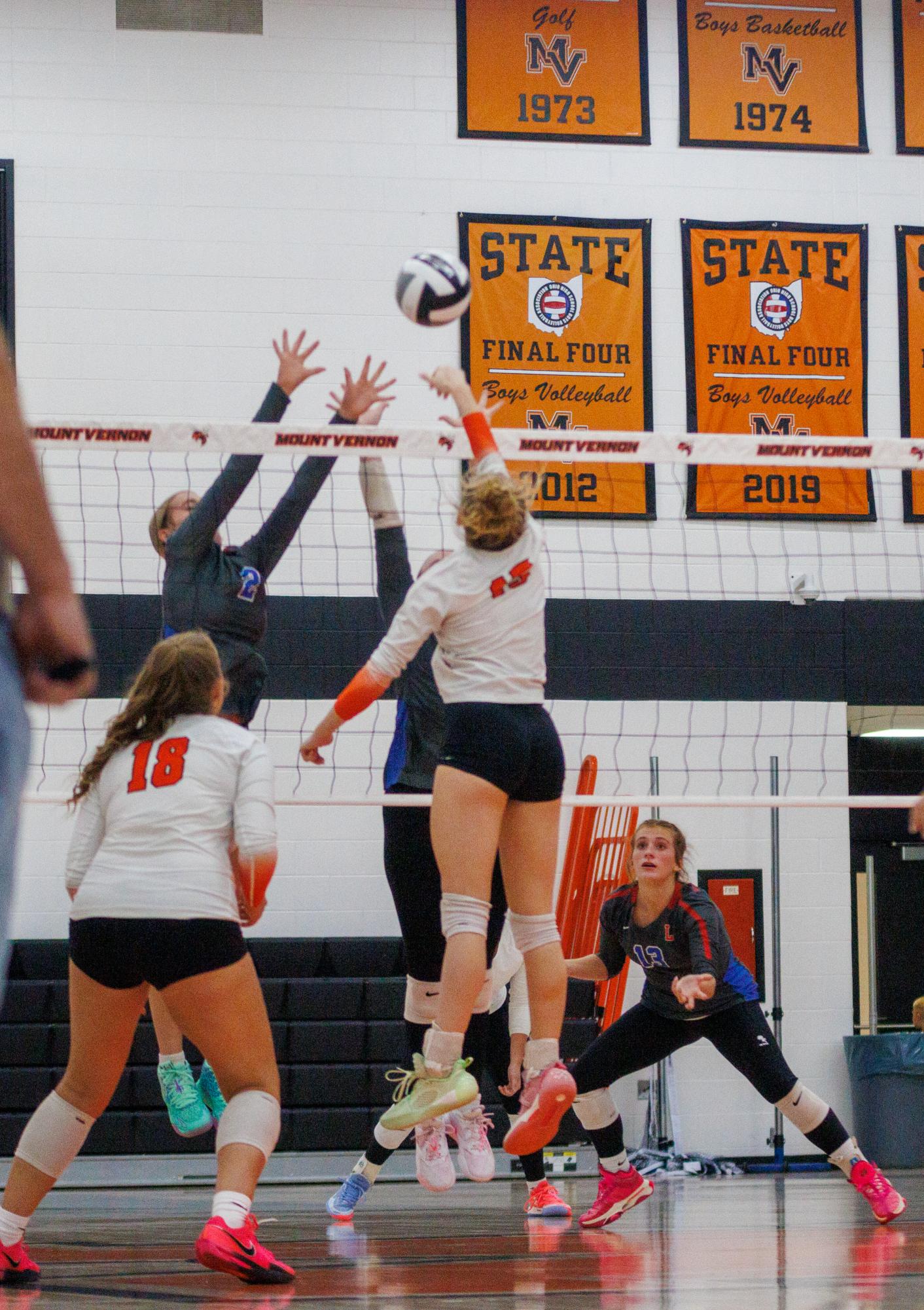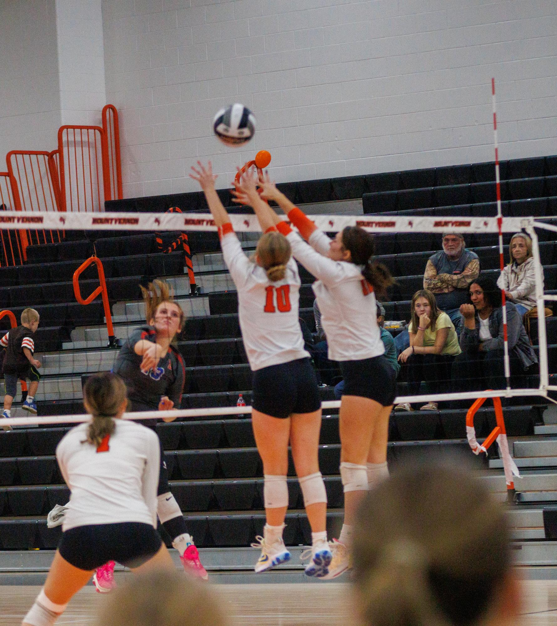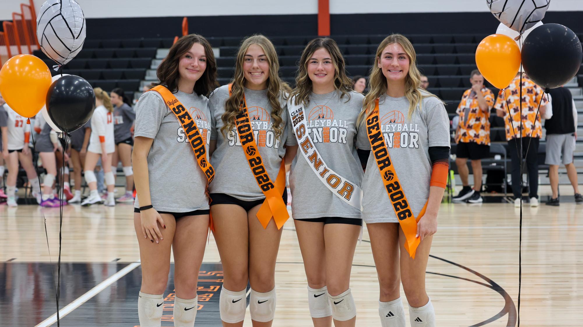 Last night, Mount Vernon Volleyball celebrated our amazing seniors — Skylar, Cora, Marina, and Audrey — in style with a win over Lakewood in four sets